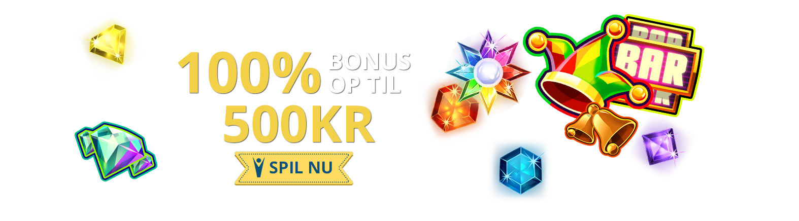 Velkomstbonus. Gælder kun første indbetaling. Min. indbetaling: 100kr, maks. bonus 500kr. Gennemspilskrav: (indbetaling plus bonus) 10X inden for 60 dage. Eksempel: Indbetal 100kr, få 100kr bonus og gennemspil 2000kr. Kun spilleautomater bidrager. Max. indsats er 50kr. Evt. gevinster ved spil over max. indsats fjernes.